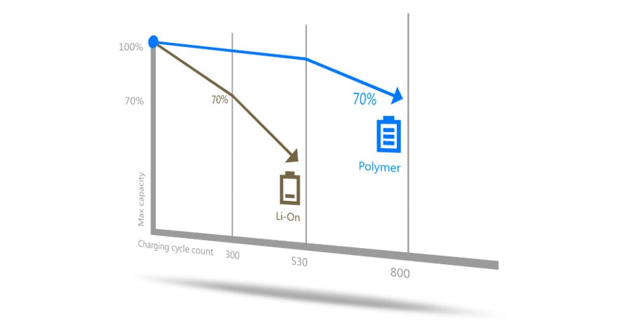 Akumulatory litowo-polimerowe zapewniają znacznie lepsze parametry, niż konwencjonalne baterie. Zapewniają trzykrotnie większą liczbę cyklów ładowania, niż zwykłe baterie, dzięki czemu mogą posłużyć znacznie dłużej przed wymianą na nowe. Dzięki takim bateriom, ASUS Transformer Book Flip jest bardziej ekologiczny - wykorzystuje mniej baterii przez cały swój cykl życia. Ulepszona technologia, ochrona środowiska i większe oszczędności.