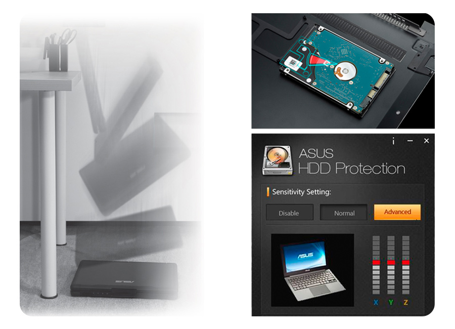 Notebooki z serii ASUSPRO B oferują zwiększoną ochronę dysków twardych dzięki absorbującej wstrząsy poduszce opracowanej z myślą o ochronie dysku przed wstrząsami podczas transportu. Dodatkowo, dyski twarde posiadają mechanizmy ochronne, na które składa się G-sensor i oprogramowanie, które aktywnie chroni przed mającymi nastąpić upadkami, zabezpieczając dane. Wbudowany, trójwymiarowy, cyfrowy przyspieszeniomierz posiada trzy tryby: wyłączony, normalna czułość oraz wysoka czułość. Ostatnia opcja jest ustawiona domyślnie i wykrywanie upadków jest zawsze aktywne..