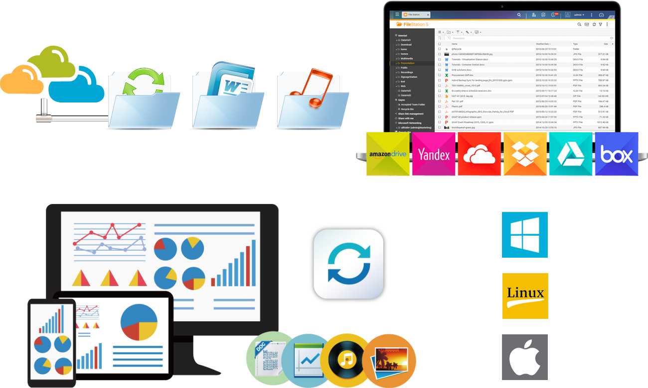 Dzięki Qsync model TS-431U zmienia się w bezpieczne centrum danych umożliwiające synchronizację plików. Jakiekolwiek pliki wysłane do TS-431U zostają udostępnione wszystkim powiązanym urządzeniom, takim jak komputery, laptopy i urządzenia mobilne. Qsync oferuje różne metody synchronizacji plików i udostępniania plików w grupie, co bardzo zwiększa elastyczność współpracy w projektach realizowanych zespołowo.