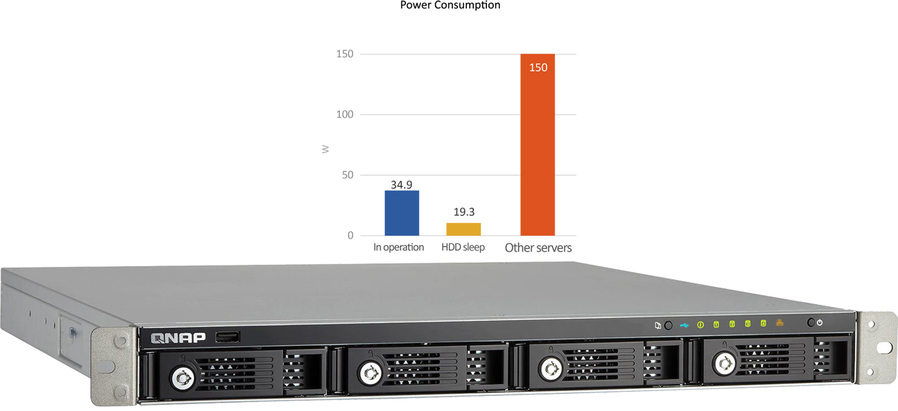 Model TS-431U jest wyposażony w energooszczędny dwurdzeniowy procesor ARM. Procesor ten zapewnia wysoką wydajność wykonywania operacji przez system i doskonale nadaje się do budowy chmury prywatnej non-stop dostępnej online bez generowania wysokich rachunków za elektryczność. Dodatkowe rozwiązania proekologiczne to m.in. przełączanie dysków twardych w tryb gotowości, planowe włączanie/wyłączanie oraz włączanie przez LAN (WoL).