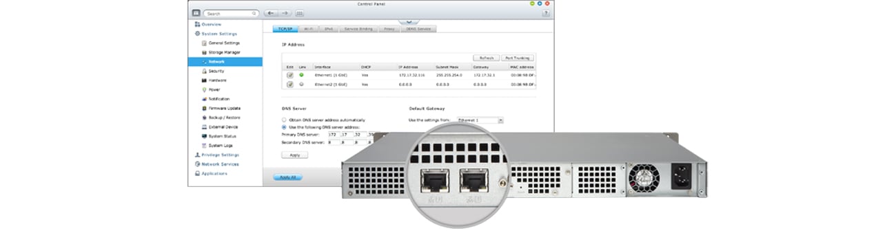Model TS-431U obsługuje wiele trybów trunkingu portów, umożliwiając administratorom IT konfigurowanie agregacji łączy w celu zwiększenia całkowitej zdolności systemu do przesyłania danych. Obsługiwana jest także funkcja awaryjnego przełączania łącza (failover) oraz funkcja dwóch adresów IP, co daje gwarancję nieprzerwanej pracy systemu.
