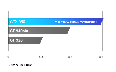 Płynność rozgrywki definiuje karta graficzna, dlatego tak ważny jest wybór wydajnego układu o dużej mocy. Karta graficzna GTX 950M zainstalowana w powyższym laptopie zapewnia o 57% wyższą wydajność, w porównaniu do innych popularnych układów graficznych. Wybieraj kartę graficzną świadomie i graj tak, jak lubisz.