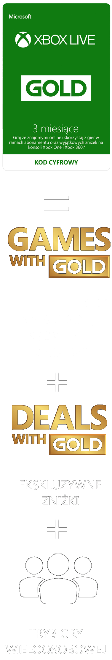 Xbox Live Gold to Twoje przepustka do świata gier online i rozrywki na najwyższym poziomie. Co miesiąc czekają na Ciebie dodatkowe gry, zaawansowany tryb wieloosobowy, ekskluzywne zniżki w sklepie Xbox Store i wiele więcej!