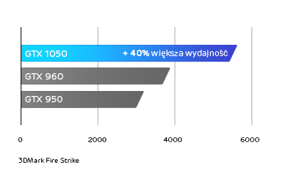 Płynność rozgrywki definiuje karta graficzna, dlatego tak ważny jest wybór wydajnego układu o dużej mocy. Karta graficzna GeForce GTX 1050 zainstalowana w powyższym laptopie zapewnia o 40% wyższą wydajność, w porównaniu do innych popularnych układów graficznych. Wybieraj kartę graficzną świadomie i graj tak, jak lubisz.