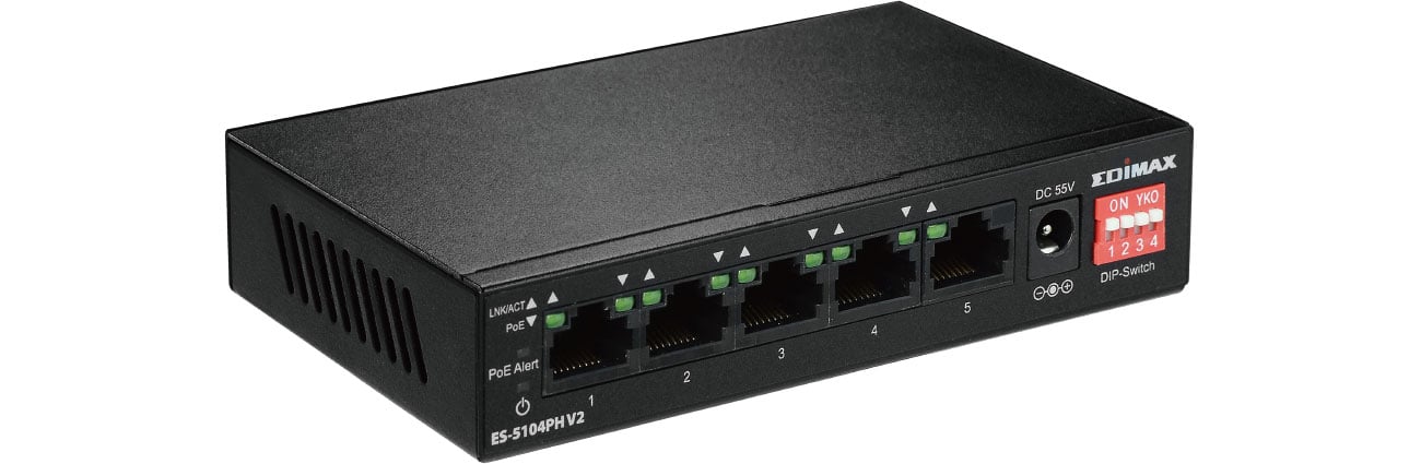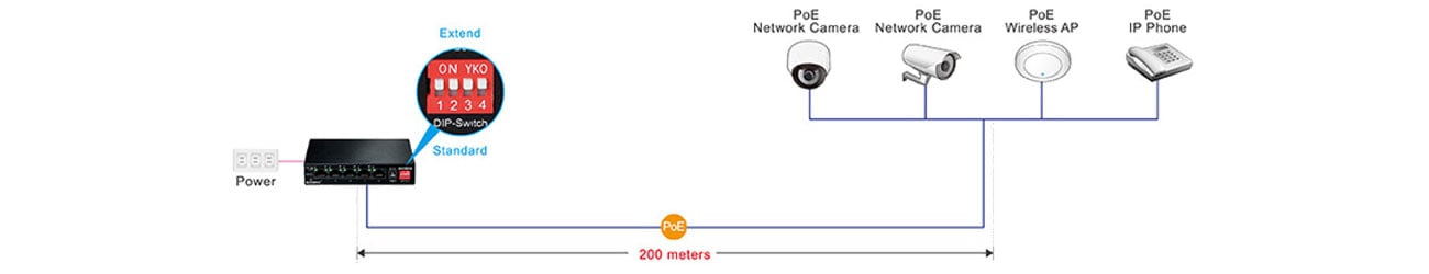 Wbudowany przełącznik DIP zapewnia rozszerzone tryby pracy po zmianie przełączników 1 i 2. ES-5104PH v2 działa jako standardowy switch IEEE802.at/af PoE, gdy wyłączniki DIP są wyłączone. Po włączeniu, ES-5104PH v2 działa na zasadzie per-portu z prędkością dupleksu 10Mb/s, ale może obsługiwać moc wyjściową PoE 30W w odległości do 200 metrów, pokonując tym samym barierę 100 metrów na kablach Ethernet UTP. Dzięki tej zupełnie nowej funkcji, ES-5104PH v2 zapewnia dodatkowe rozwiązanie dla rozszerzenia odległości 802.3at/af PoE i oszczędza koszty instalacji kabla Ethernet.