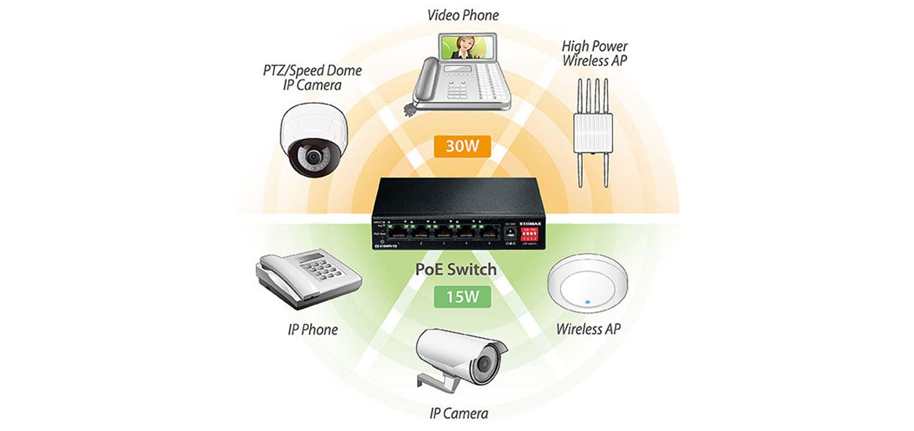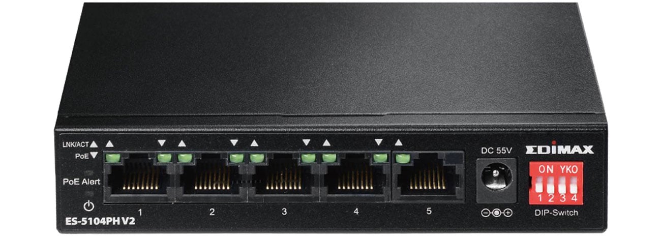 Edimax ES-5104PH v2 posiada cztery porty IEEE802.3at Power over Ethernet (PoE +), które dostarczają do 30 watów energii elektrycznej na port. Może konwertować standardową zasilanie 100~240V do niskonapięciowego 50~57V DC, aby zasilać akcesoria sieciowe zgodne ze standardem IEEE802.3at, za pomocą istniejących kabli sieciowych (LAN).
