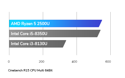 Procesor jest sercem i siłą napędową laptopa. Jego moc obliczeniowa, liczba rdzeni oraz częstotliwość taktowania zegarów definiują dynamikę pracy sprzętu, czyli płynność obsługi programów i gier. Dzięki testom porównawczym wiemy, że procesor AMD Ryzen 5 2500U zapewnia wydajność porównywalną z jednostką Intel Core i5-8350U.
