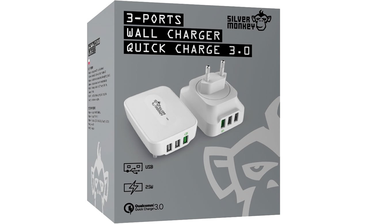 Dzięki ładowarce sieciowej Silver Monkey możesz ładować do 3 urządzeń jednocześnie. Ponadto jeden z portów wyposażony jest w funkcję szybkiego ładowania, co umożliwia błyskawiczne i bezpieczne uzupełnienie baterii w smartfonie, tablecie i innym urządzeniu ładowanym przez USB. Zapewnia to rzeczywista moc wyjściowa 25 W oraz liczne zabezpieczenia, w tym systemy przeciwprzepięciowe, przeciwzwarciowe i Smart Chip.