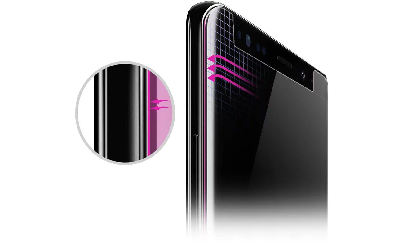 Ze względu na zakrzywione krawędzie ekranu szkło hartowane Dome Glass jest mniejsze niż cały przedni panel smartfonu. Dzięki temu ściśle przylega do ekranu i nie odkleja się, chroniąc kluczowy obszar wyświetlacza przed zarysowaniami.