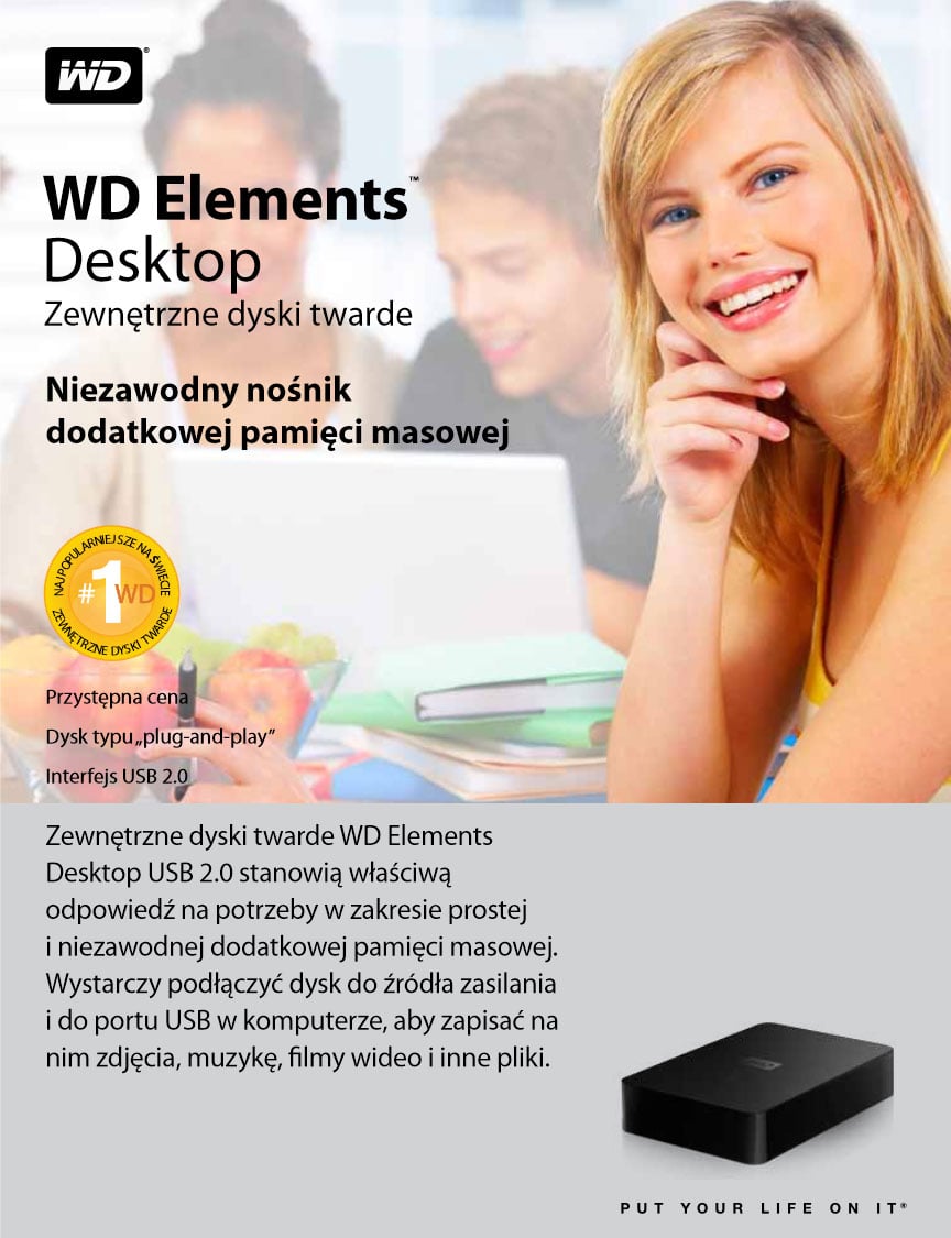 Minimalne zużycie energii Dyski zewnętrzne WD Elements z technologią WD GreenPower Technology zostały zaprojektowane tak, aby oszczędzać energię. Zużycie energii przez dysk wewnętrzny jest obniżone o 30%, tryb uśpienia redukuje zasilanie w stanie bezczynności, a funkcja oszczędzania energii włącza i wyłącza dysk wraz z komputerem. |