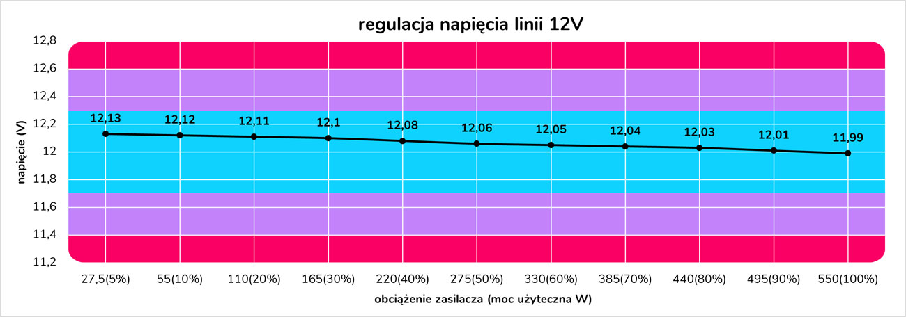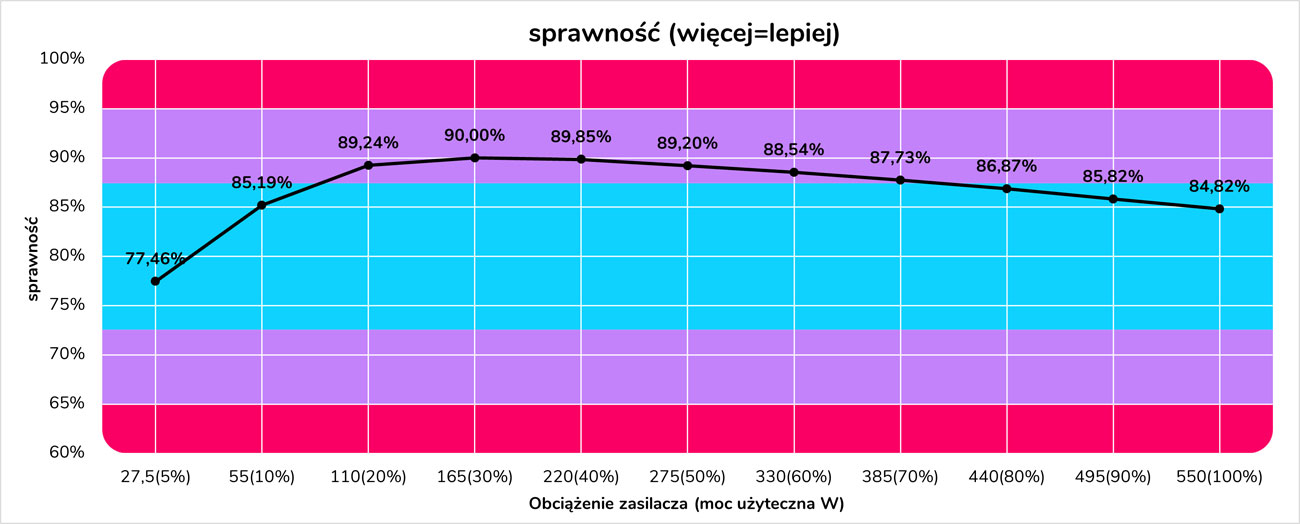 Zapoznaj się ze szczegółowymi wykresami obrazującymi wyniki testów wydajności zasilacza Corsair CX550M w całym zakresie obciążenia. Kliknij w jeden z poniższych przycisków, aby rozwinąć lub zwinąć wybrany wykres.