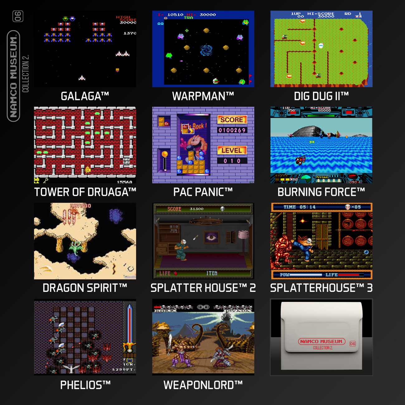 Kartridż numer 6 z kolekcją Namco 2 zawiera 11 innych 8-bitowych i 16-bitowych klasyków od Namco Bandai, w tym kultowe gry Galaga, PAC Mania i Splatterhouse 2.