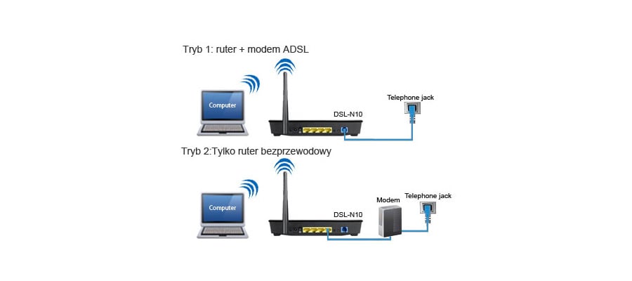 Ethernet WAN pozwala na pracę DSL-N10 B1 w dwóch trybach. DSL-N10 może być użyty jako modem ADSL z ruterem albo jako sam ruter bezprzewodowy.