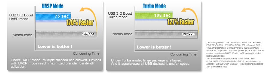 Nowa technologia ASUS USB 3.0 Boost obsługuje UASP (USB Attached SCSI Protocol), najnowszy standard USB 3.0. Dzięki technologii USB 3.0 Boost, prędkość przesyłu danych w urządzeniach USB wzrasta do 170%, zwiększając dodatkowo i tak imponujące prędkości przesyłu USB 3.0. Oprogramowanie ASUS automatycznie przyspiesza prędkości transferu danych w kompatybilnych urządzeniach USB 3.0, bez ingerencji użytkownika.
