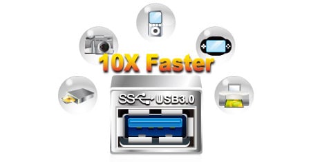 Poczuj zalety ultraszybkiego transferu danych 4,8 Gb/s w USB 3.0 – najnowszym standardzie połączeń. Interfejs USB 3.0, zbudowany z myślą o łatwym podłączaniu nowoczesnych podzespołów i urządzeń, przesyła dane nawet 10-krotnie szybciej, a zarazem jest zgodny z komponentami USB 2.0.