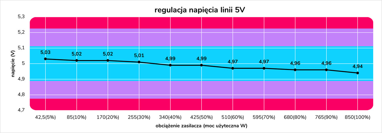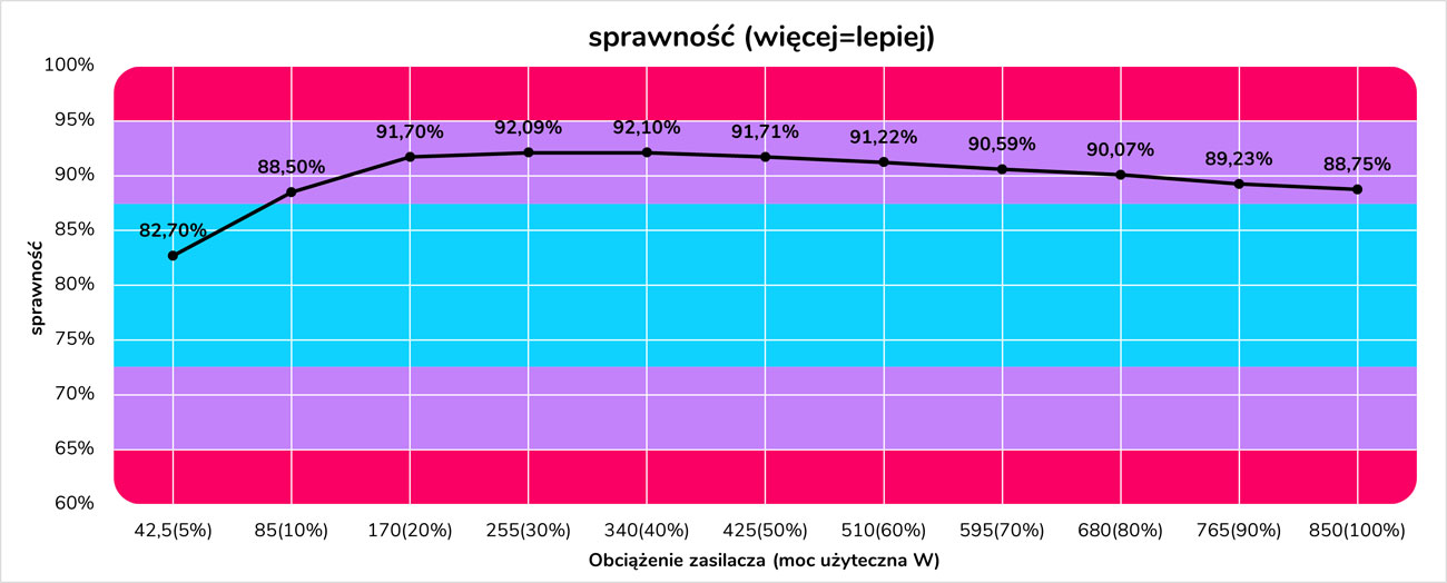 Zapoznaj się ze szczegółowymi wykresami obrazującymi wyniki testów wydajności zasilacza Fortron HYDRO G PRO 850W w całym zakresie obciążenia. Kliknij w jeden z poniższych przycisków, aby rozwinąć lub zwinąć wybrany wykres.