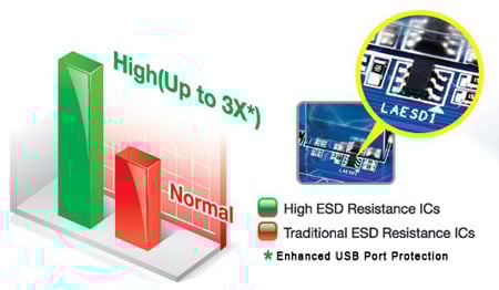 |  | Ochrona przed wyładowaniami elektrostatycznymi  Wszystkie płyty główne GIGABYTE z technologią Ultra Durable ™ 4 Classic zostały wyposażone w wysokiej jakości chipy IC, które cechują się większą odpornością na wyładowania elektrostatyczne (ESD) niż tradycyjne IC. | |