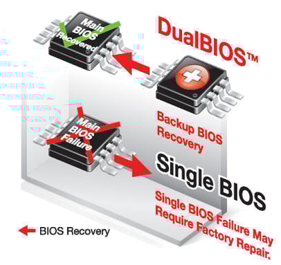 | DualBIOS 3 TB HDD+ Hybrid EFI  GIGABYTE DualBIOS jest opatentowaną technologią, która automatycznie odzyskuje dane z BIOS’u w sytuacji, gdy zostanie on uszkodzony. 2 fizyczne kości BIOS’u zapewniają podwójne zabezpieczenie przed utratą najważniejszych danych. Proces przywracania BIOs’u nie wymaga przy tym żadnej ingerencji użytkownika. | ||
