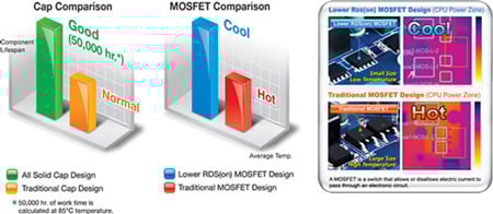 |  | Ochrona przed wysoką temperaturą  GIGABYTE używa kondensatorów polimerowych oraz tranzystorów Lower RDS(on) MOSFETs zapewniających znaczącą redukcję temperatury, zwłaszcza w porównaniu z tradycyjnymi tranzystorami MOSFET. Te rozwiązania gwarantują dłuższą żywotność i stabilność komputera. | |