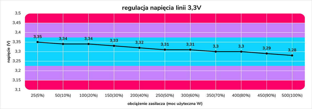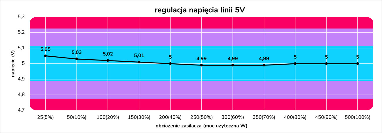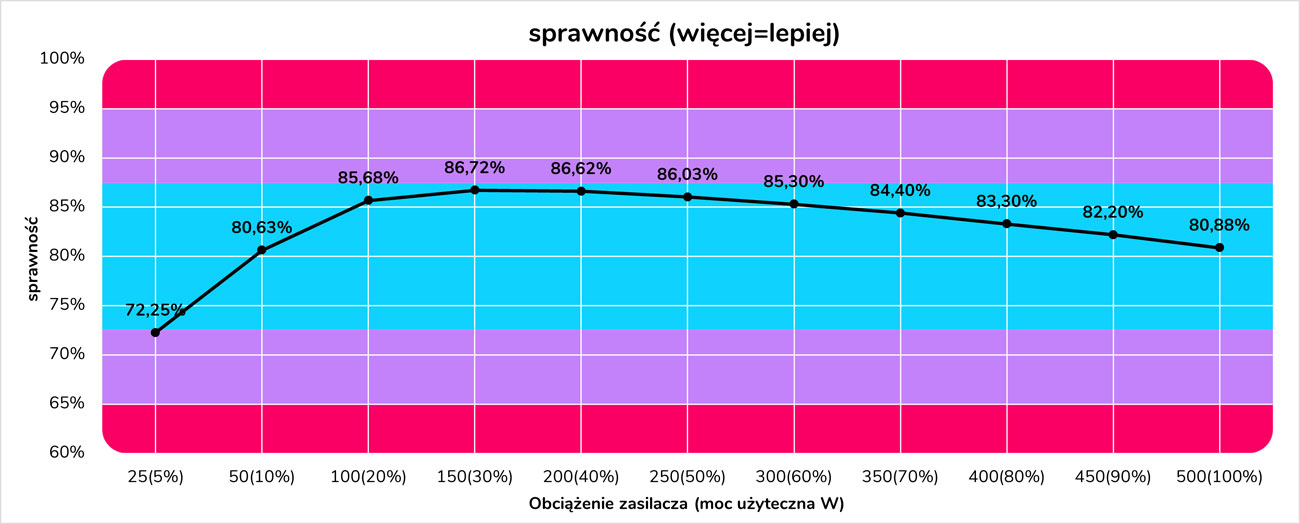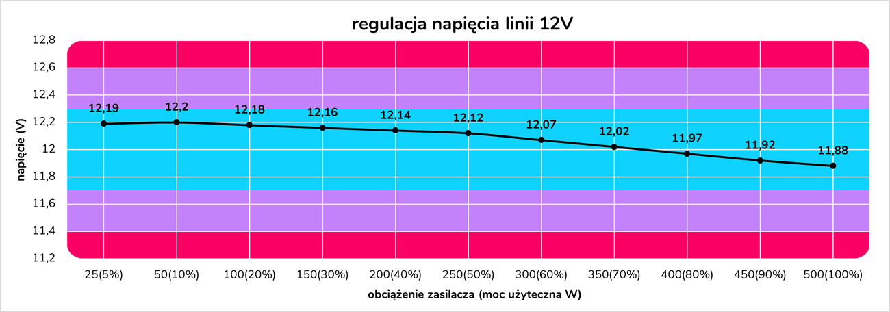 Zapoznaj się ze szczegółowymi wykresami obrazującymi wyniki testów wydajności zasilacza Cooler Master Elite V4 500W w całym zakresie obciążenia. Kliknij w jeden z poniższych przycisków, aby rozwinąć lub zwinąć wybrany wykres.
