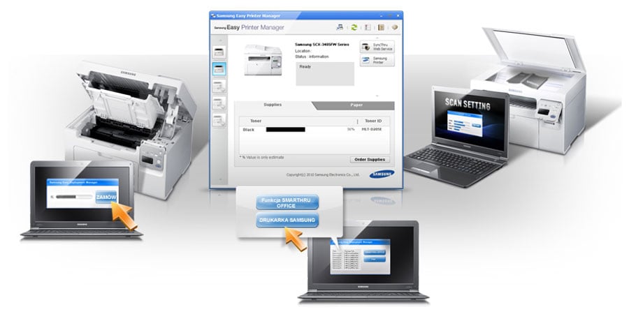 Odkryj uproszczone zarządzanie wydrukiem Samsung Easy Printer Manager. To zintegrowane oprogramowanie pozwala szybko skonfigurować urządzenie i monitorować aktualny status zużycia materiałów eksploatacyjnych. Nie martw się o niespodziewanie kończący się toner. Easy Printer zawsze powiadomi Cię na czas o potrzebie wymiany.