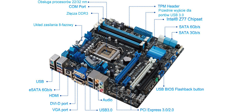 Chipset Intel Z77 Express obsługuje gniazdo 1155 dla procesorów 3 generacji Intel Core oraz 2 generacji Core i7, i5, i3, Pentium, Celeron. Poprawia wydajność poprzez zastosowanie połączeń typu punkt-punkt, co znacznie zwiększa przepustowość i stabilność. Co więcej, chipset Z77 posiada 4 porty USB 3.0, które zapewniają 10-krotnie większą szybkość przesyłania danych. Chipset Z77 Express posiada również funkcję iGPU, która pozwala użytkownikom na wykorzystanie możliwości najnowszych kart zintegrowanych firmy Intel.