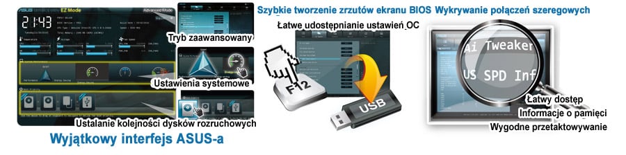 ASUS UEFI BIOS to pierwszy sterowany myszką BIOS z graficznym interfejsem. Jest dostępny w kilku trybach i bardzo przyjazny dla użytkownika. Obsługuje dyski twarde większe niż 2,2TB w 64-bitowych systemach operacyjnych.