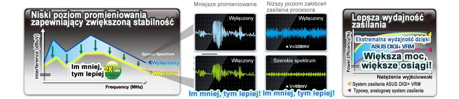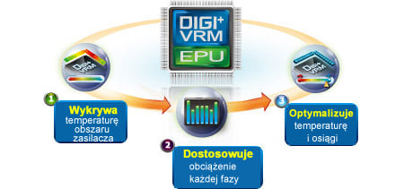 Zalety cyfrowego układu zasilania ASUS DIGI+ VRM W przeciwieństwie do poprzednich wersji VRD, IntelŽ VRD12 wykorzystuje sygnały cyfrowe (SVID). By uzyskać doskonałe zasilanie, ASUS specjalnie zaprojektował DIGI+ VRM tak, by całkowicie zespoić go z tą nową technologią. |