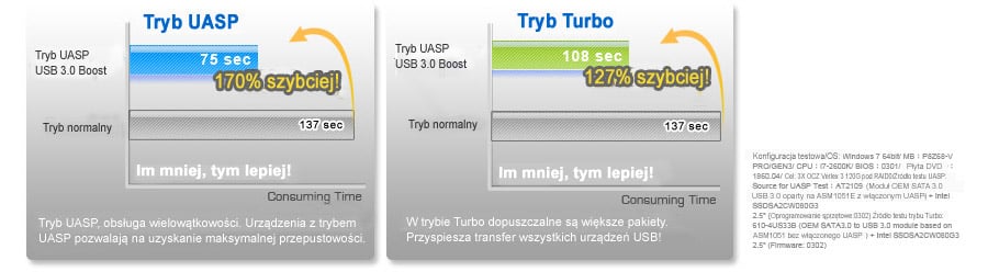 USB 3.0 Boost.![]() Szybsza transmisja danych USB 3.0 dzięki UASPNowa technologia ASUS USB 3.0 Boost obsługuje UASP (USB Attached SCSI Protocol), najnowszy standard USB 3.0. Dzięki technologii USB 3.0 Boost urządzenie USB może ulec przyspieszeniu nawet do 170% przy i już niezwykle szybkich transferach USB 3.0. Oprogramowanie firmy ASUS automatycznie przyspiesza prędkość transferu danych w kompatybilnych urządzeniach peryferyjnych USB 3.0 bez jakiejkolwiek ingerencji ze strony użytkownika.
