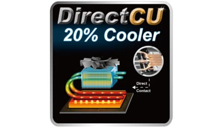 DirectCU wykorzystuje dwa spłaszczone miedziane przewody cieplne o przekroju 8mm, które bezpośrednio stykają się z procesorem graficznym i zapewniają o 20% niższą temperaturę.